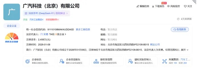 據(jù)最新消息,廣汽集團近日悄然在北京注冊成立廣汽科技(北京)有限公司,注冊資本2408萬元。