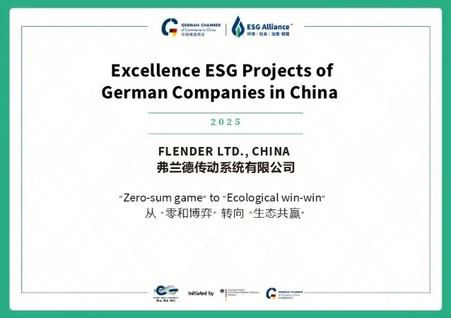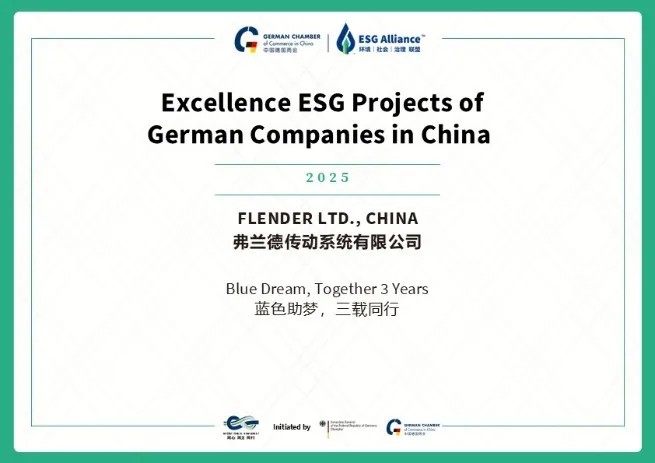 2025年,弗蘭德傳動系統(tǒng)有限公司憑借“零和博弈轉(zhuǎn)向生態(tài)共贏”與“藍色助夢,三載同行”兩大項目,榮獲“2025年德國在華企業(yè)卓越ESG項目獎”。 該獎項由ESG聯(lián)盟與中國德國商會(German Chamber of Commerce in China)聯(lián)合組織,并由德國上海總領(lǐng)事館(Consulate General of the Federal Republic of Germany in Shanghai)與中國德國商會共同發(fā)起,旨在表彰德國企業(yè)在華優(yōu)秀的企業(yè)社會責任與可持續(xù)發(fā)展實踐,展現(xiàn)企業(yè)在可持續(xù)發(fā)展領(lǐng)域的深度探索。