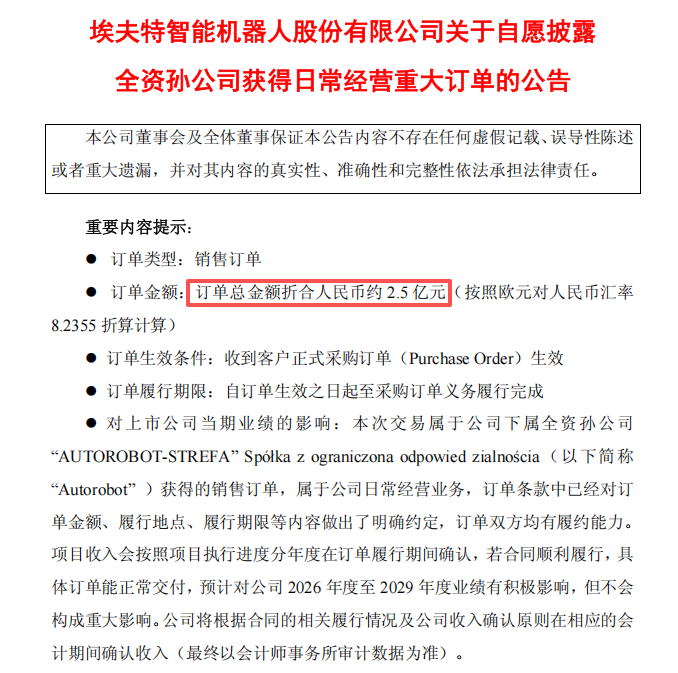 埃夫特智能機器人股份有限公司發布公告表示,其下屬全資孫公司Autorobot收到一份關于汽車產線建設的采購訂單,訂單總金額折合人民幣約2.5億元。