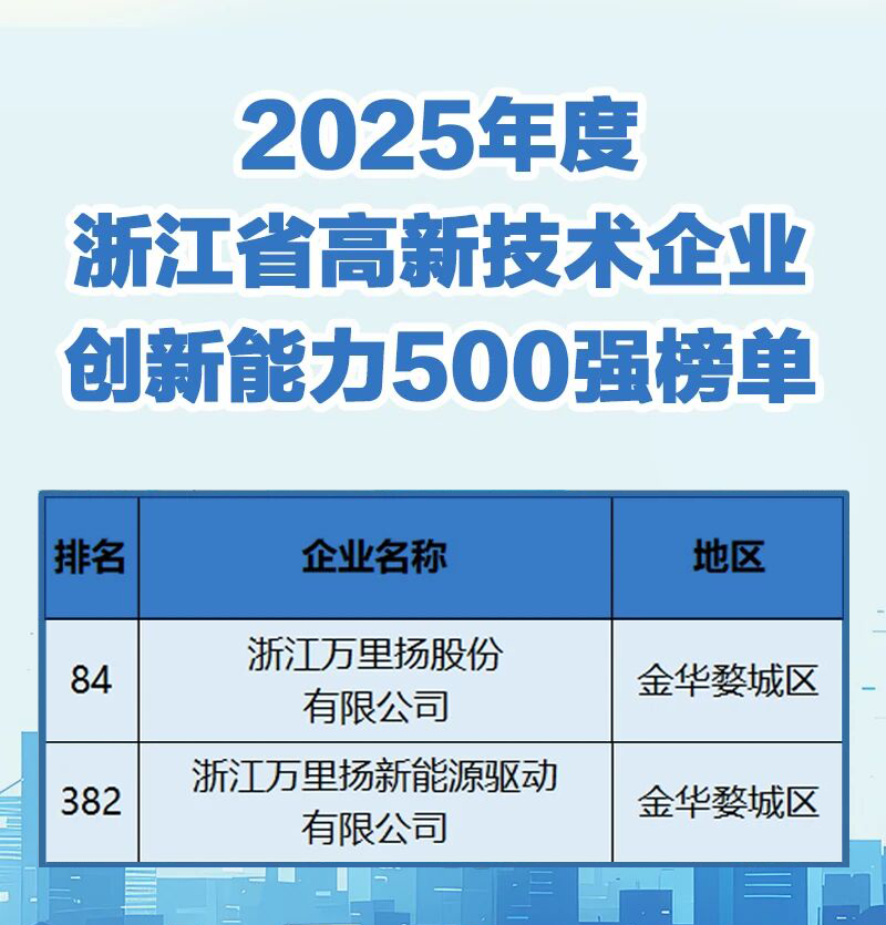 近日,2025年度浙江省高新技術企業創新能力500強名單正式發布,萬里揚及下屬子公司浙江萬里揚新能源驅動有限公司均榮列其中,這也是萬里揚連續第四年躋身該榜單。