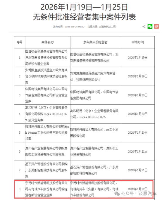 2月4日,國家市場監督管理總局發布《2026年1月19日—1月25日無條件批準經營者集中案件列表》,其中,寧德時代新能源科技股份有限公司與奇瑞商用車(安徽)有限公司、奇瑞汽車股份有限公司新設合營企業案,已于2026年1月22日審結并獲得無條件批準。