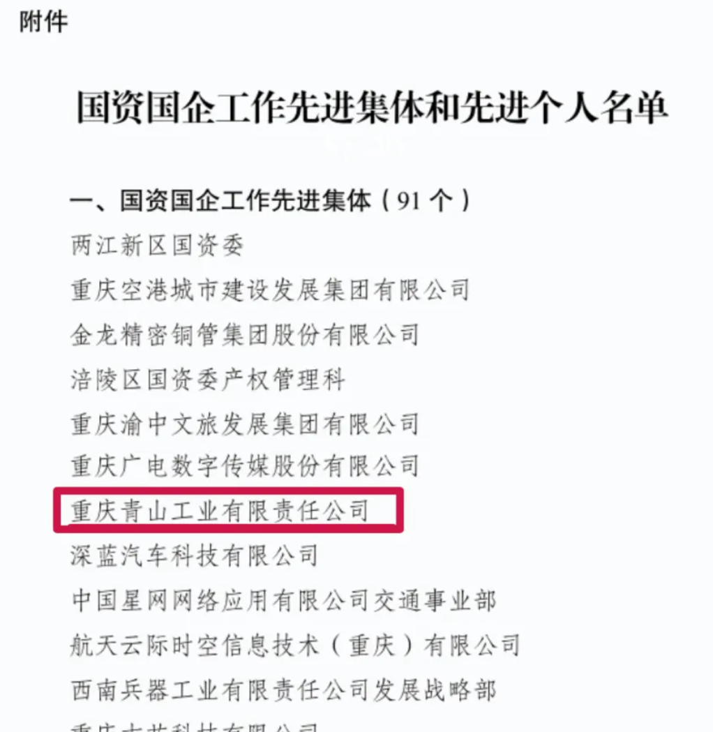 3 月 3 日,重慶市人力資源和社會保障局、重慶市國有資產監督管理委員會聯合發布《關于表彰國資國企工作先進集體和先進個人的決定》,表彰國資國企工作先進集體和個人 ,重慶青山工業有限責任公司憑借在改革發展、經營攻堅、科技創新等方面的突出表現,榮獲國資國企工作先進集體榮譽稱號。