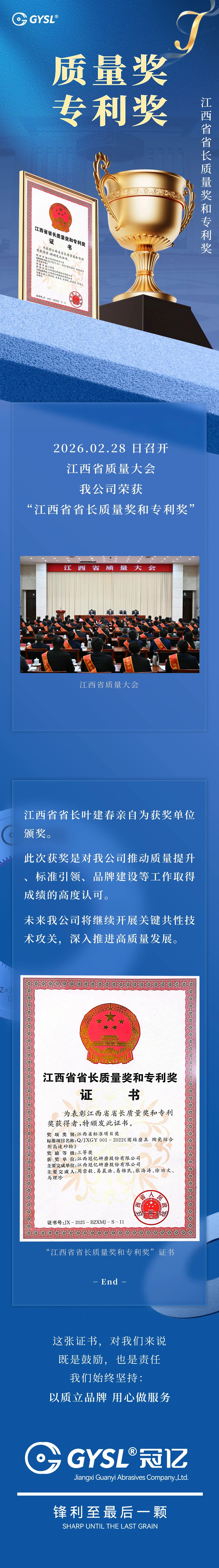 冠億研磨榮獲 “江西省省長質量獎和專利獎”兩項大獎。
