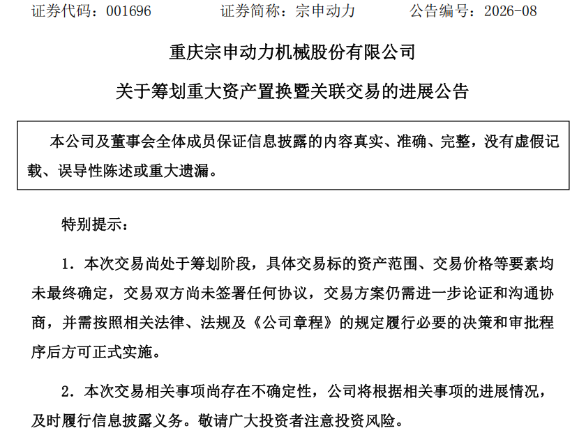 4月13日,重慶宗申動力機械股份有限公司(簡稱:宗申動力)發布重大資產置換暨關聯交易進展公告,明確公司正籌劃與隆鑫通用動力股份有限公司(簡稱:隆鑫通用)進行業務板塊互換,推進業務專業化整合。截至目前,雙方正有序組織對交易標的進行盡職調查,具體資產范圍、交易價格等要素均未最終確定,交易方案尚需進一步論證并經董事會、股東大會審議通過后方可實施。