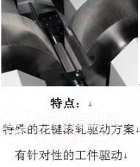 使用ROLLIN滾壓加工內花鍵是寶飛螺最新的滾壓工藝,其原理是在壓力下利用成形模具的偏心滾壓運動將模具的外形壓到環形工件的內徑上。出來花鍵以外也可以滾壓內螺紋或進行精整加工。內花鍵滾壓可以競爭替代插齒,拉削等切削加工工藝。