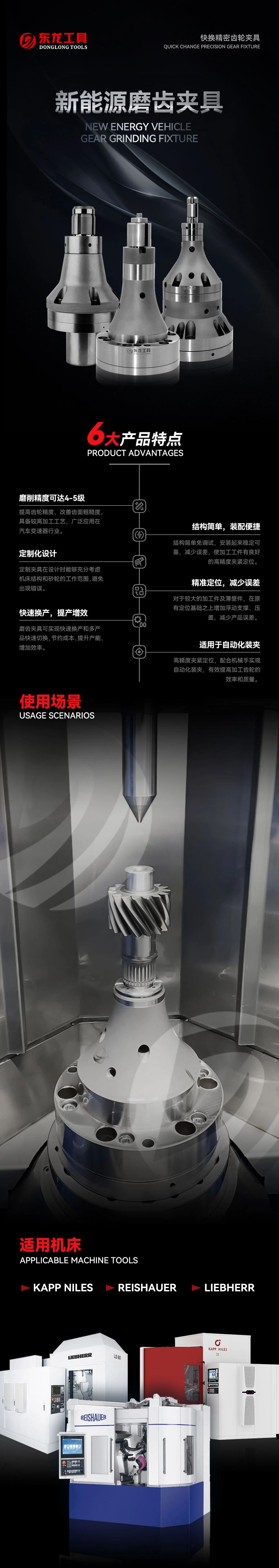 東龍設(shè)計研發(fā)的磨齒夾具,采用了定制化結(jié)構(gòu)設(shè)計,確保了裝夾的便捷性與夾持的穩(wěn)固性。該夾具的磨削精度可達4-5級,不僅有效改善了齒面粗糙度,還顯著提升了齒輪的加工精度。此外,它助力企業(yè)輕松實現(xiàn)快速換產(chǎn),特別適用于自動化生產(chǎn)及無人化工廠環(huán)境。在實際應(yīng)用中,磨齒夾具的引入使得生產(chǎn)效率得到了顯著提升,同時在節(jié)省人力成本方面也取得了顯著效果。