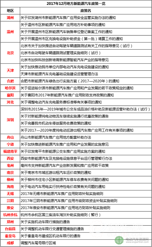 經(jīng)電動汽車資源網(wǎng)統(tǒng)計,2017年12月,湖州、溫州、天津、合肥、襄陽、河北、北京、深圳、舟山、哈爾濱、南平、西安、亳州、南京、柳州等省市發(fā)布新能源汽車政策,包括地方新能源汽車補貼標準、新能源智能汽車產(chǎn)業(yè)規(guī)劃、運營補貼、充電設(shè)施建設(shè)規(guī)劃、充電服務(wù)費等。點擊政策名可查看政策原文!
