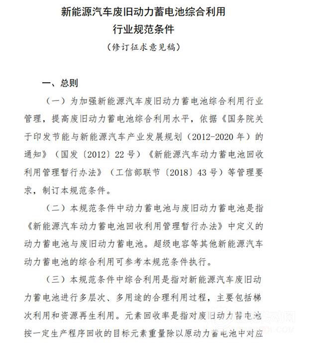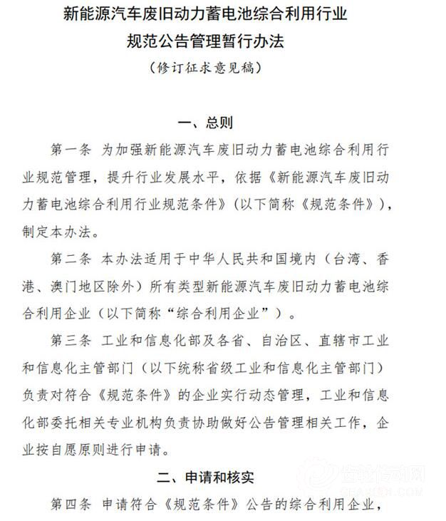 隨著新能源汽車的大規模推廣和應用,廢舊動力蓄電池的綜合利用問題正在得到越來越多的關注和重視。近日,在深入調研基礎上,工業和信息化部對2016年公告發布的《新能源汽車廢舊動力蓄電池綜合利用行業規范條件》(以下簡稱《規范條件》)和《新能源汽車廢舊動力蓄電池綜合利用行業規范公告管理暫行辦法》(以下簡稱《辦法》)進行了修訂并正式向社會公開征求意見。