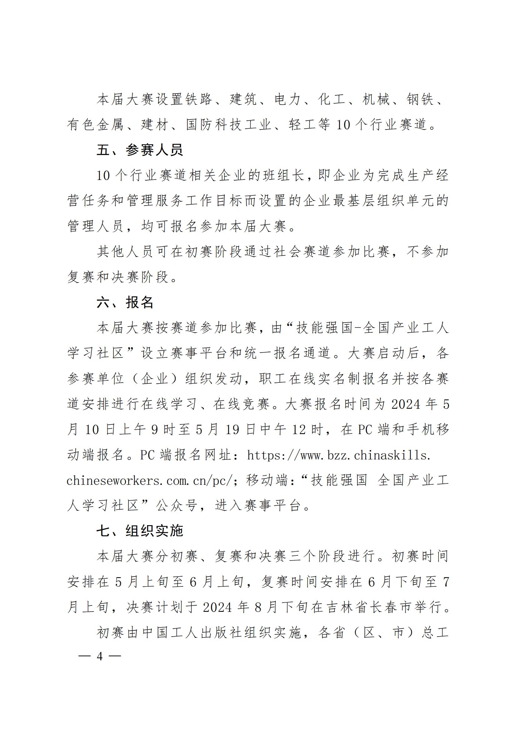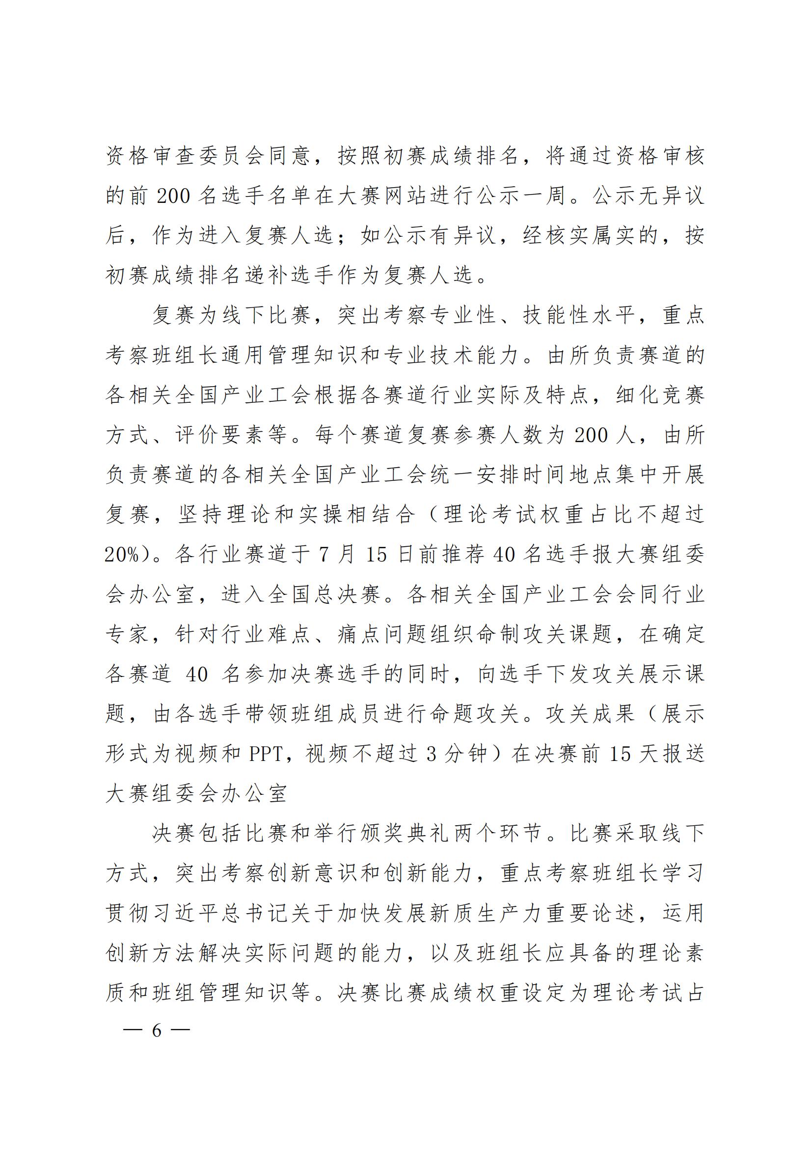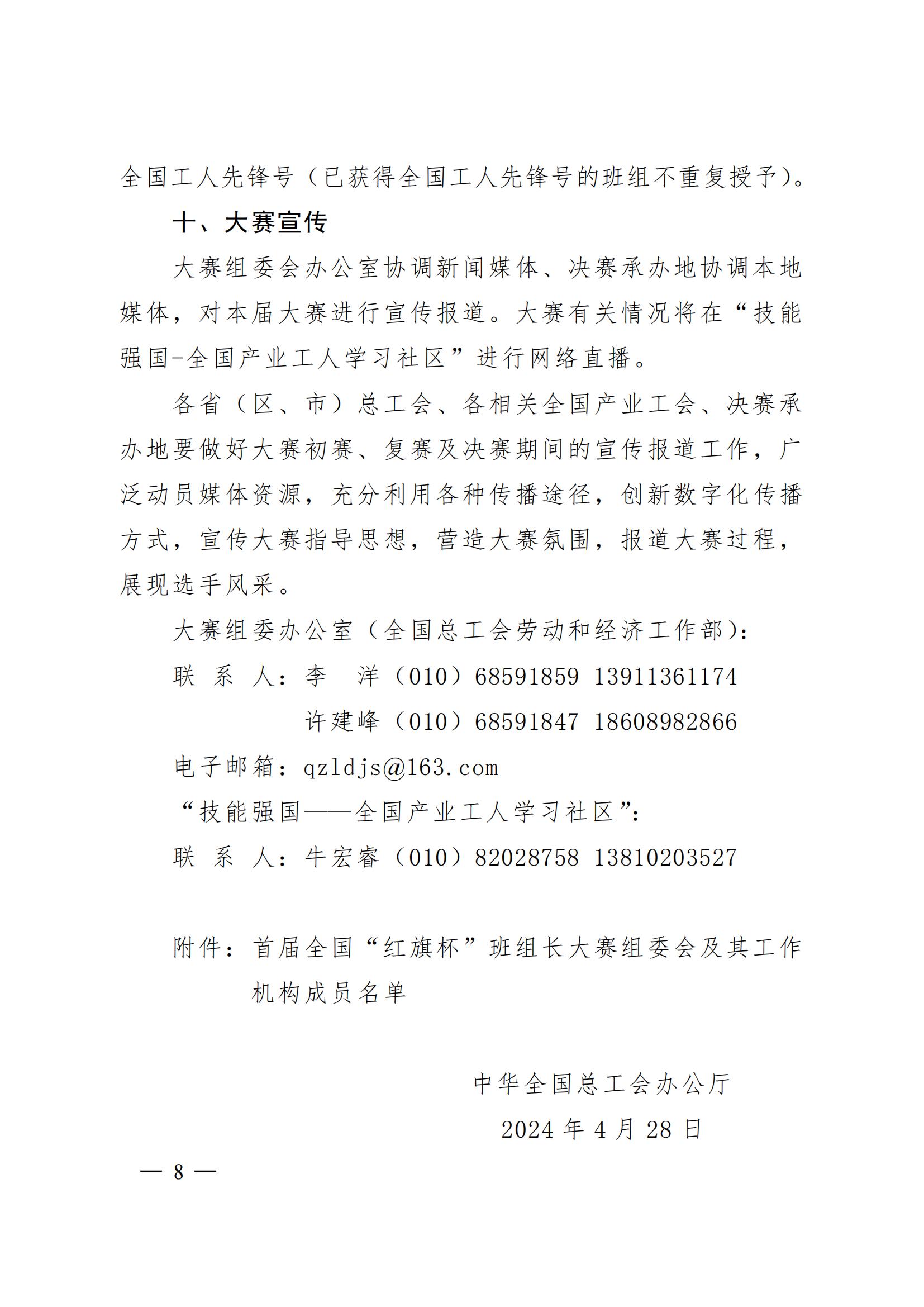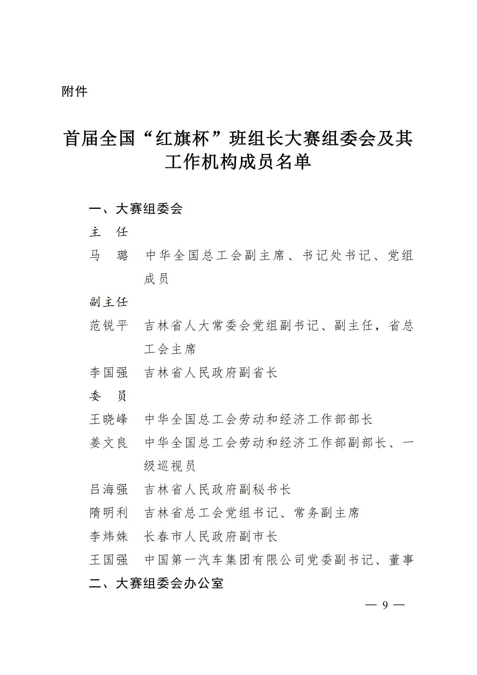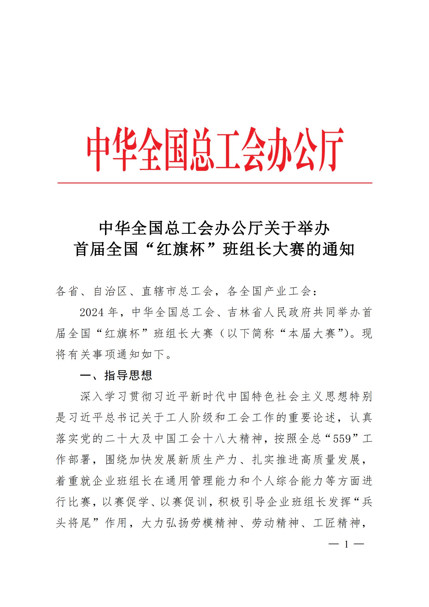 2024 年,中華全國總工會、吉林省人民政府共同舉辦首 屆全國“紅旗杯”班組長大賽(以下簡稱“本屆大賽”)。現將有關事項通知如下。