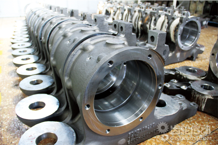 和諧2型機車采用的是電力驅(qū)動轉(zhuǎn)向架,由裝在轉(zhuǎn)向架上的牽引電動機通過傳動齒輪箱產(chǎn)生扭矩使輪對轉(zhuǎn)動,轉(zhuǎn)動的輪對通過輪軌間的粘著作用產(chǎn)生機車牽引力,機車牽引力經(jīng)過軸箱裝置傳給轉(zhuǎn)向架構(gòu)架,再經(jīng)牽引裝置傳給車體,而后再經(jīng)車鉤緩沖裝置實現(xiàn)列車牽引。軸箱裝置與一系懸掛連接,其結(jié)構(gòu)參數(shù)對機車走行質(zhì)量、能源消耗和零部件壽命有直接影響。大同機車一年要制造1440多個轉(zhuǎn)向架,一個轉(zhuǎn)向架上有4個軸箱體,共生產(chǎn)軸箱體約5760個,因此,軸箱體的加工效率成為了挑戰(zhàn)大同機車加工能力的關(guān)鍵問題。