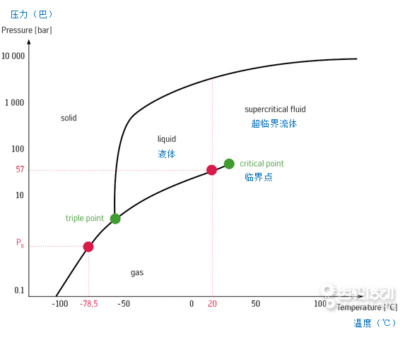 二氧化碳相曲線圖:室溫下液態(tài)二氧化碳以57.8巴以上的壓力在被送到切削位置。