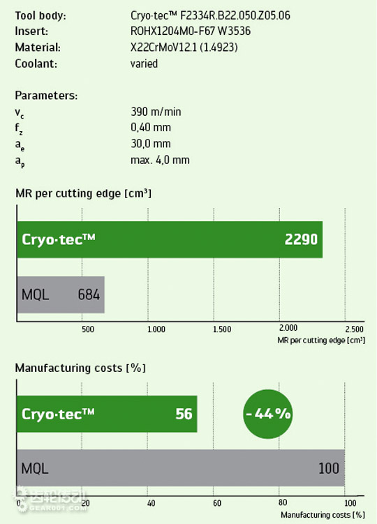 2013年初,瓦爾特與茨維考西撒克遜應(yīng)用科學(xué)大學(xué)生產(chǎn)技術(shù)研究所(IfP)攜手合作,對采用液體二氧化碳低溫加工進(jìn)行基本研究,其中切削刃口已經(jīng)冷卻到–78.5℃,茨維考實(shí)驗(yàn)全部采用了外部冷卻供應(yīng),并對各種冷卻策略(MQL, 乳化液、二氧化碳及其各種組合)進(jìn)行了相互比較。 比較結(jié)果表明,二氧化碳法具有最大的冷卻潛力,具有十分明顯的優(yōu)勢,在加工不銹鋼渦輪葉片時(shí),成本節(jié)省高達(dá)40%。通過這種開拓性基礎(chǔ)研究并與瑞士斯達(dá)拉格機(jī)械工程公司密切合作,瓦爾特率先成為全世界采用低溫冷卻原理的刀具專業(yè)公司,為行業(yè)各種應(yīng)用提供了切實(shí)可行的解決方案。2013年3月,這種技術(shù)首次取得成功,并命名為“Cryo?tec™”。在EMO 2013, 瓦爾特和斯達(dá)拉格獲得了MM獎(jiǎng),獲獎(jiǎng)理由是他們的解決方案在銑削加工最具創(chuàng)新性。