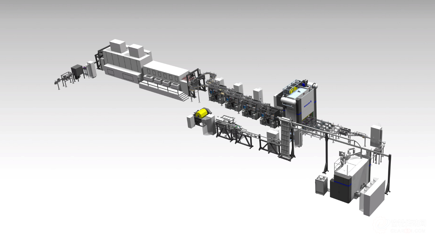 s 圖9: 生產線由沖擊擠壓機(右下)、精沖整形壓力機、切邊機、清洗裝置和烘干裝置組成。