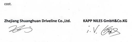 浙江雙環傳動機械股份有限公司董事長吳長鴻,KAPP NILES GmbH&Co.KG遠東總協調、卡帕耐爾斯卡帕亞洲科技(嘉善)有限公司董事長Georg Feng (馮國)共同見證簽約。出席簽約儀式的領導:雙環傳動總經理MIN ZHANG(張民),雙環(嘉興)總經理李勝,雙環傳動董事長秘書黃偉,卡帕耐爾斯卡帕亞洲副總經理郭旭東,CBN車間主任沈建華。