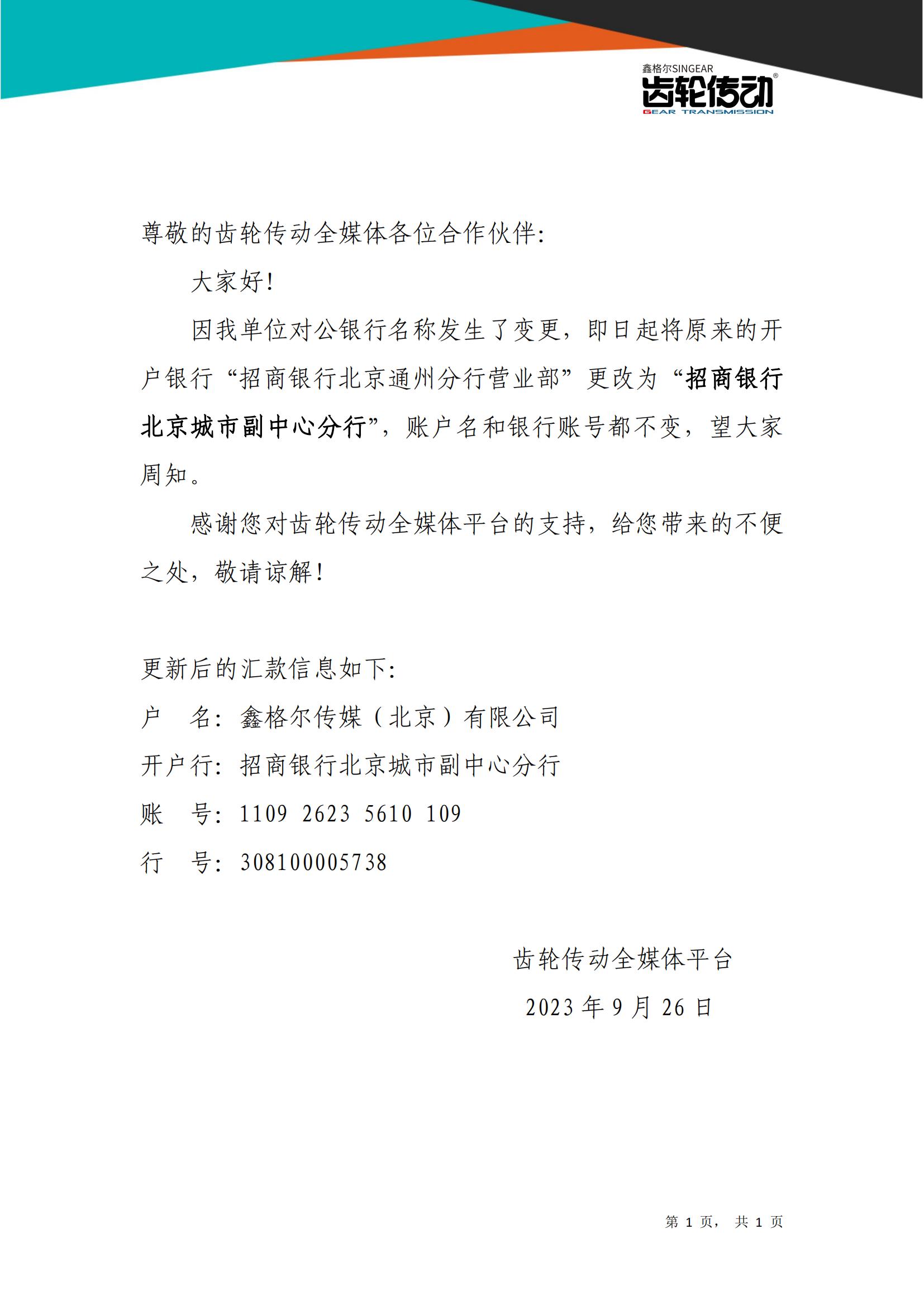 因我單位對公銀行名稱發生了變更,即日起將原來的開戶銀行“招商銀行北京通州分行營業部”更改為“招商銀行北京城市副中心分行”,賬戶名和銀行賬號都不變,望大家周知。感謝您對齒輪傳動全媒體平臺的支持,給您帶來的不便之處,敬請諒解!