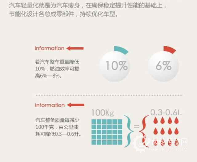 汽車(chē)輕量化并不是一味地降低質(zhì)量或門(mén)板厚度,與“減重”的概念并不能簡(jiǎn)單等同。汽車(chē)輕量化是在完善或改進(jìn)汽車(chē)綜合性能的基礎(chǔ)上,盡可能地降低車(chē)身重量,達(dá)到質(zhì)量降低、結(jié)構(gòu)優(yōu)化、安全性能提高和成本降低這四者有機(jī)結(jié)合的目標(biāo)。根據(jù)相關(guān)研究表明,汽車(chē)75%的油耗都與其質(zhì)量有關(guān),比如滾動(dòng)阻力、加速阻力和梯度阻力等,汽車(chē)整備質(zhì)量每下降10%,油耗即可下降6-8%,排放下降4%;車(chē)輛質(zhì)量降低100KG,百公里油耗即可降低0.3-0.6L。因此,汽車(chē)質(zhì)量越大,燃油經(jīng)濟(jì)性就表現(xiàn)的越差。