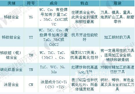硬質合金按成分分類可分為鎢鈷合金、鎢鈦鈷合金、鎢鈦鉭(鈮)鈷合金、碳化鈦基合金和涂層合金。