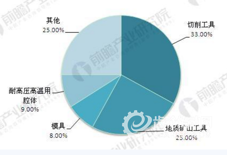 硬質合金主要應用在切削刀具、礦用工具、模具和耐高壓高溫甩腔體等方面,其中切削刀具和礦用工具比例分別占到了硬質合金應用的33%和25%。切削刀具中,硬質合金主要作為刀具材料,如車刀、銑刀、刨刀、鉆頭、鏜刀等,用于切削鑄鐵、有色金屬、塑料、化纖、石墨、玻璃、石材和普通鋼材以及難加工的材料等,切削加工主要依托機床來實現。礦用工具方面,硬質合金主要作為鑿巖工具、采掘工具、鉆探工具,在礦產、石油開采、基礎設施建設等方面發揮重要作用。