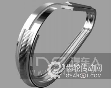 CVT金屬帶主要有舍弗勒的鋼鏈?zhǔn)戒搸Ш筒┦赖匿撈戒搸煞N對(duì)應(yīng)于圖2和圖3,圖3中鋼帶是由非常多的三角形鋼片組成。博世目前占有非常大的CVT變速箱鋼帶的市場(chǎng)份額。傳動(dòng)鏈條與推力鋼帶相比較,可以傳遞的扭矩容量大、鏈條在旋轉(zhuǎn)半徑縮小時(shí)沒有金屬帶存在的摩擦問題,因此傳動(dòng)效率高;但是缺點(diǎn)也十分明顯,噪聲大、結(jié)構(gòu)緊湊型不好。