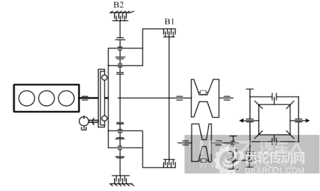 由圖可知,發(fā)動(dòng)機(jī)動(dòng)力經(jīng)過飛輪、傳動(dòng)盤、輸入軸傳遞到行星排太陽輪部分,另外行星架連接倒擋制動(dòng)器,內(nèi)齒圈連接主動(dòng)帶輪,前進(jìn)擋離合器布置在太陽輪和內(nèi)齒圈之間。