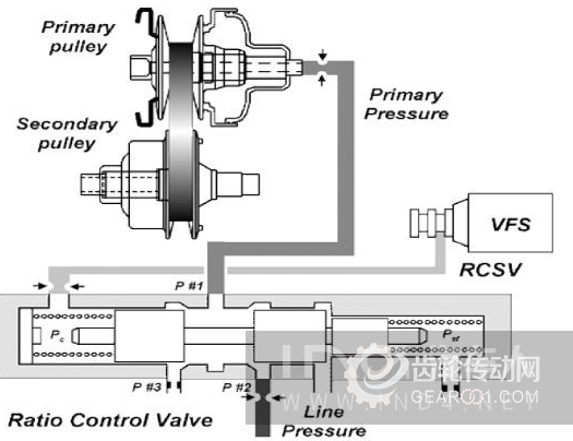 CVT的結(jié)構(gòu)包括主動(dòng)輪組、從動(dòng)輪組、金屬帶和液壓泵等基本部件。主動(dòng)輪組和從動(dòng)輪組都由可動(dòng)盤和固定盤組成,可動(dòng)盤與固定盤都是錐面結(jié)構(gòu),與油缸靠近的一側(cè)錐盤可以在軸上滑動(dòng),它們的錐面形成V型槽來與V型金屬傳動(dòng)帶嚙合。通過可動(dòng)盤作軸向移動(dòng)來改變主動(dòng)輪、從動(dòng)輪錐面與傳動(dòng)帶的嚙合半徑,從而改變傳動(dòng)比。可動(dòng)盤的軸向移動(dòng)是通過控制系統(tǒng)和液壓系統(tǒng)調(diào)節(jié)液壓泵油缸壓力來實(shí)現(xiàn)的,由于可動(dòng)盤的移動(dòng)可以實(shí)現(xiàn)連續(xù)調(diào)節(jié),主動(dòng)輪和從動(dòng)輪的工作半徑便可以實(shí)現(xiàn)連續(xù)調(diào)節(jié),從而實(shí)現(xiàn)了無級(jí)變速。