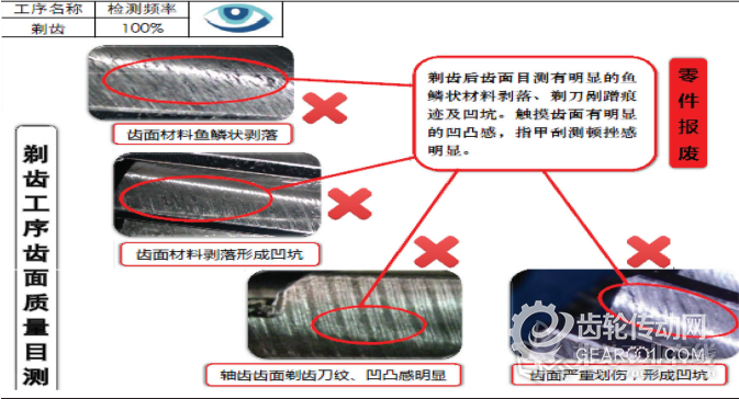 這一方式屬于事后檢驗,為將齒面拉傷現象消滅在萌芽狀態,故總結我公司齒輪設計研究結論,結合多年來齒輪售后故障中早期磨損現象的調研結果,同工藝研究部門共同確立了《剃齒工序齒面質量目測標準》。以生產現場快速判定零件表面是否拉傷和拉傷的程度分級,便于現場及時調整加工過程參數,將拉傷問題消除在萌芽狀態,也便于對不合格品進行判定及處理。