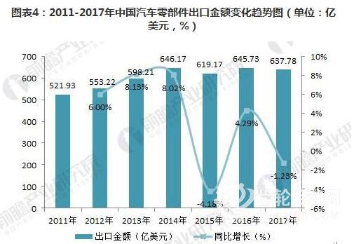 2016年,我國汽車零部件出口結束了2015年的負增長局面,累計出口金額為645.73億美元,較上年同比增長4.29%,汽車零部件出口市場出現了復蘇跡象。但2017年,汽車零部件出口金額再度小幅下滑,累計出口金額637.78億美元,同比下滑1.23%。