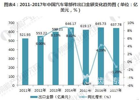 2016年,我國汽車零部件出口結束了2015年的負增長局面,累計出口金額為645.73億美元,較上年同比增長4.29%,汽車零部件出口市場出現了復蘇跡象。但2017年,汽車零部件出口金額再度小幅下滑,累計出口金額637.78億美元,同比下滑1.23%。