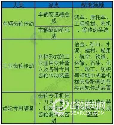 按照產(chǎn)品用途,齒輪行業(yè)可以細分為三類:車輛齒輪、工業(yè)齒輪及齒輪專用裝備;車輛齒輪產(chǎn)品應用的領(lǐng)域包括各類汽車、摩托車、工程機械、農(nóng)機和軍用車輛等;工業(yè)齒輪產(chǎn)品應用的領(lǐng)域包括船用、礦山、冶金、航空、電力等;齒輪專用裝備主要為齒輪專用機床、刀具等齒輪制造配套設備。