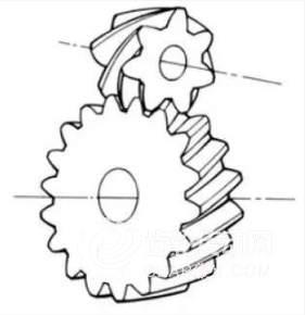 圓柱蝸桿副在交錯軸間傳動時的名稱。可在斜齒齒輪副或斜齒齒輪與正齒輪副的情況下使用。運(yùn)轉(zhuǎn)雖然平穩(wěn),但只適合于使用在輕負(fù)荷的情況下。