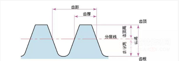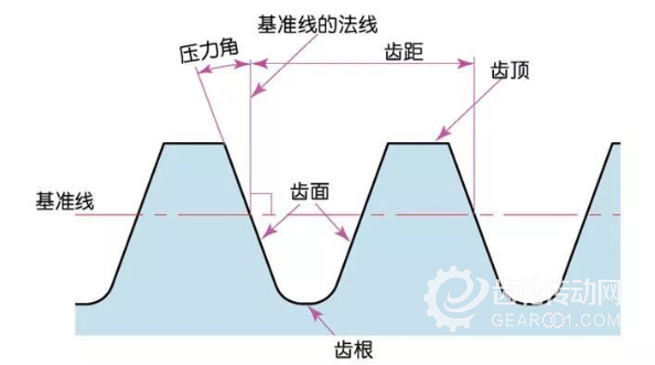 模數(shù)乘以圓周率即可得到齒距(p),齒距是相鄰兩齒間的長度。