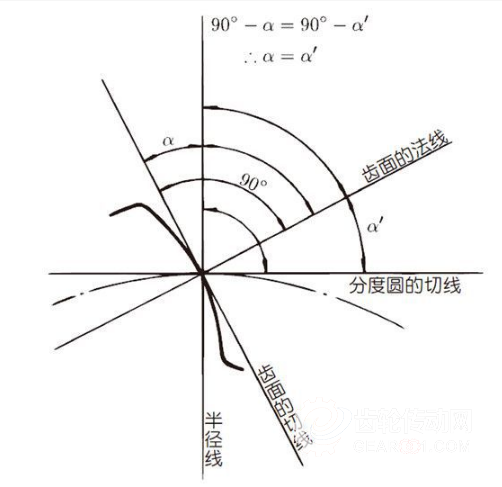 壓力角是在齒面的一點(一般是指節(jié)點)上,半徑線與齒形的切線間所成之角度。如圖所示,α為壓力角。因為α’=α,所以α’也是壓力角。