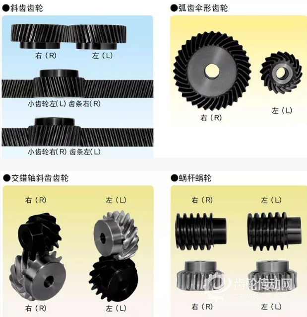 斜齒齒輪、弧齒傘形齒輪等,輪齒呈螺旋狀的齒輪,螺旋方向和配合是一定的。螺旋方向是指當(dāng)齒輪的中心軸指向上下,從正面看上去時,輪齒的方向指向右上的是[右旋],左上的是[左旋]。各種齒輪的配合如下所示。