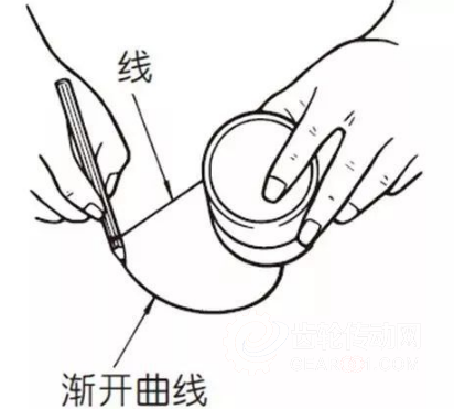 將一端系有鉛筆的線纏在圓筒的外周上,然后在線繃緊的狀態(tài)下將線漸漸放開。此時,鉛筆所畫出的曲線即為漸開曲線。圓筒的外周被稱為基圓。
