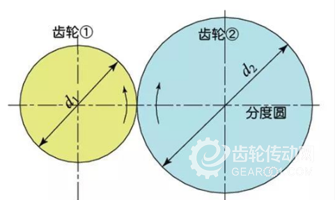 兩輪嚙合時的模樣,看上去就像是分度圓直徑大小為d1、d2兩個摩擦輪(Friction wheels)在傳動。但是,實際上漸開線齒輪的嚙合取決于基圓而不是分度圓。