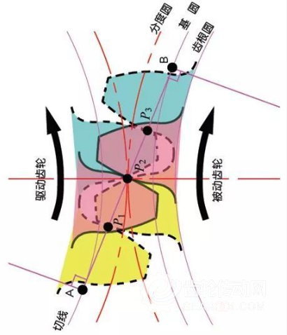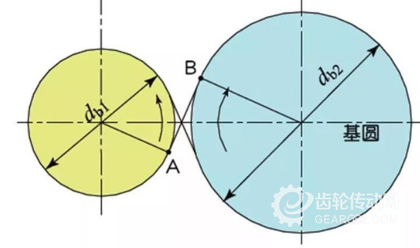 基圓的公切線A一B被稱為嚙合線。齒輪的嚙合點都在這條嚙合線上。