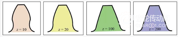 漸開線齒形曲線隨齒數(shù)多少而不同。齒數(shù)越多,齒形曲線越趨于直線。隨齒數(shù)增加,齒根的齒形變厚,輪齒強(qiáng)度增加。