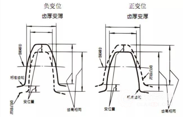 變位有正變位和負(fù)變位。雖然齒高相同,但齒厚不同。齒厚變厚的為正變位齒輪,齒厚變薄的為負(fù)變位齒輪。