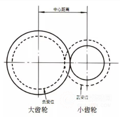 無法改變兩個齒輪的中心距時,對小齒輪進(jìn)行正變位(避免根切),對大齒輪進(jìn)行負(fù)變位,以使中心距相同。這種情況下,變位量的絕對值相等。