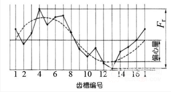 齒距累積總偏差(Fp)測定全輪齒齒距偏差做出評價。齒距累積偏差曲線的總振幅值為齒距總偏差。