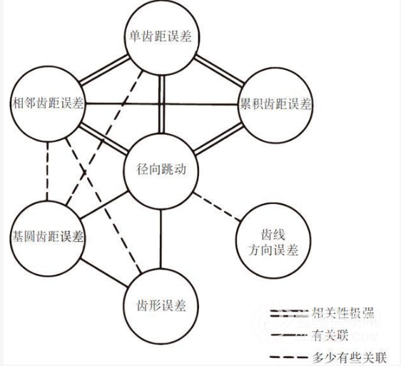 齒輪的各部分精度之間是有關(guān)聯(lián)的,一般來說,徑向跳動與其它誤差的相關(guān)性強(qiáng),各種齒距誤差間的相關(guān)性也很強(qiáng)。