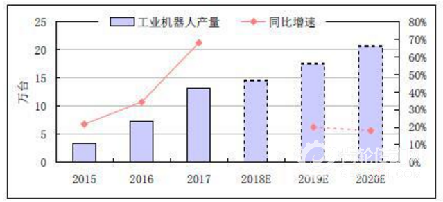 2018–2020年我國工業(yè)機(jī)器人產(chǎn)量及同比增速預(yù)測