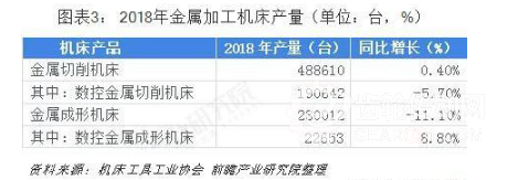 機床工具行業規上企業2018年金屬切削機床產量為488610臺,同比增長0.4%。其中,數控金屬切削機床產量為190642臺,同比降低5.7%。金屬成形機床產量為230012臺,同比降低11.1%。其中,數控金屬成形機床產量為22653臺,同比增長8.8%。