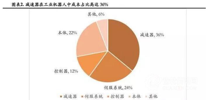 根據機器人網的相關數據顯示,三大核心零部件占機器人成本的比例超過70%,其中,減速器成本占比為三大核心零部件最高者,數值為36%。