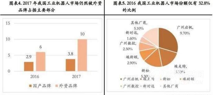 2017年,中國工業機器人13.8萬的銷量中,外資品牌占據了絕大部分的市場份額,國內自主品牌機器人在銷量上有所增加,但所占份額仍然較少。