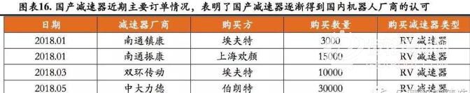 2018年1月,埃夫特、上海歡顏從南通振康分別購買了3000臺和15000臺RV減速器;3月份,雙環傳動與埃夫特簽署了戰略合作協議,約定埃夫特將在雙環傳動采購10000臺RV減速器;2018年5月,伯朗特與中大力德簽訂迄今為止最大的RV減速器戰略框架合同,約定在2019年12月前采購不低于30000臺RV減速器。