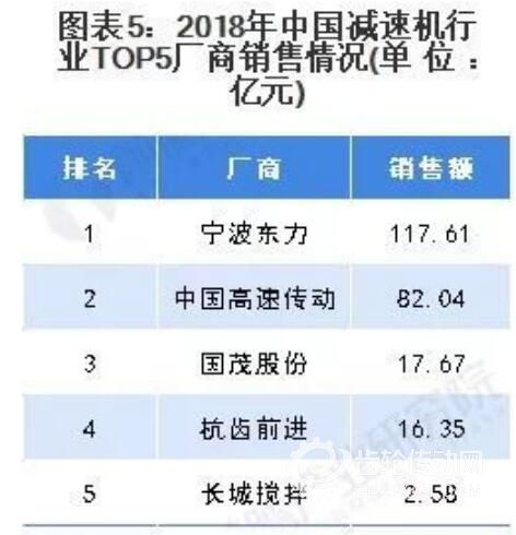 2018年,我國減速機行業(yè)TOP5的廠商分別為寧波東力、中國高速傳動、國茂股份、杭齒前進和長城攪拌,寧波東力的銷售收入為117.61億元,中國高速傳動為82.04億元,國茂股份為17.67億元。