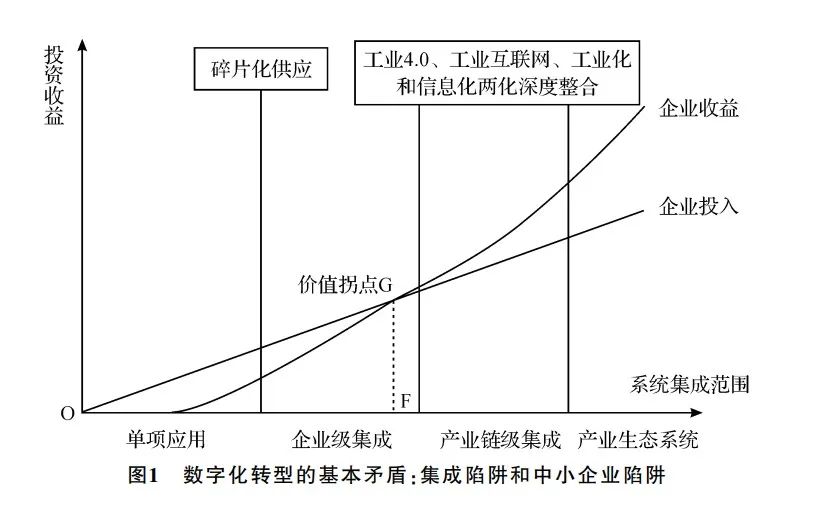 綜上所述,對于制造業(yè)數(shù)字化改造障礙的認(rèn)識,國內(nèi)外學(xué)者和企業(yè)實(shí)踐者基本達(dá)成一致:數(shù)字化轉(zhuǎn)型存在兩大基本矛盾,即集成陷阱和中小企業(yè)陷阱。“所謂‘集成陷阱’是指企業(yè)管理信息的全局優(yōu)化需求與碎片化供給的矛盾。具體表現(xiàn)為企業(yè)在工業(yè)化和信息化融合發(fā)展的初期階段,各個職能部門各自搞了許多信息系統(tǒng),卻鮮見信息系統(tǒng)間的連接與集成,最終成為一個個‘信息孤島’”。一般認(rèn)為,數(shù)字化改造只有突破了集成陷阱(突破圖1價(jià)值拐點(diǎn)G),企業(yè)才會進(jìn)入工業(yè)化和信息化兩化深度融合發(fā)展的高級階段,進(jìn)而進(jìn)入實(shí)質(zhì)性受益階段。而“所謂‘中小企業(yè)陷阱’是指對于廣大中小企業(yè)來說,由于缺資金、缺人才,對數(shù)字化轉(zhuǎn)型大都抱有‘不敢轉(zhuǎn)、不愿轉(zhuǎn)、不能轉(zhuǎn)、不會轉(zhuǎn)、不善轉(zhuǎn)’的態(tài)度;即使有勇于嘗試者,也大都在沒有超越前期沉沒成本(圖1中OF段)、尚未突破“集成陷阱”、數(shù)字化改造效果尚未顯現(xiàn)前消耗完了所有的資源。”