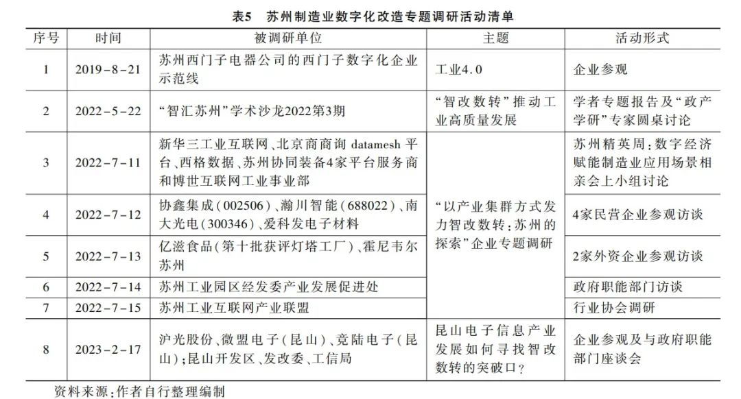蘇州規(guī)上企業(yè)工業(yè)總產(chǎn)值2021年末到達(dá)41308.1億元,全國城市排名第二;根據(jù)工信聯(lián)《全國兩化融合發(fā)展水平區(qū)域比較》,江蘇省工業(yè)化和信息化融合發(fā)展水平連續(xù)七年位居全國第一,而蘇州又在“兩化融合”方面的成績?nèi)☆I(lǐng)先;蘇州在中國獲評“燈塔工廠”數(shù)量的城市排名第一(表2)。為此我們課題組6人(其中3位教授,3位博士)歷時(shí)三年半,長期跟蹤工業(yè)4.0和制造業(yè)數(shù)字化改造實(shí)踐,并在蘇州當(dāng)?shù)亻_展了一系列調(diào)研活動,參見表5。