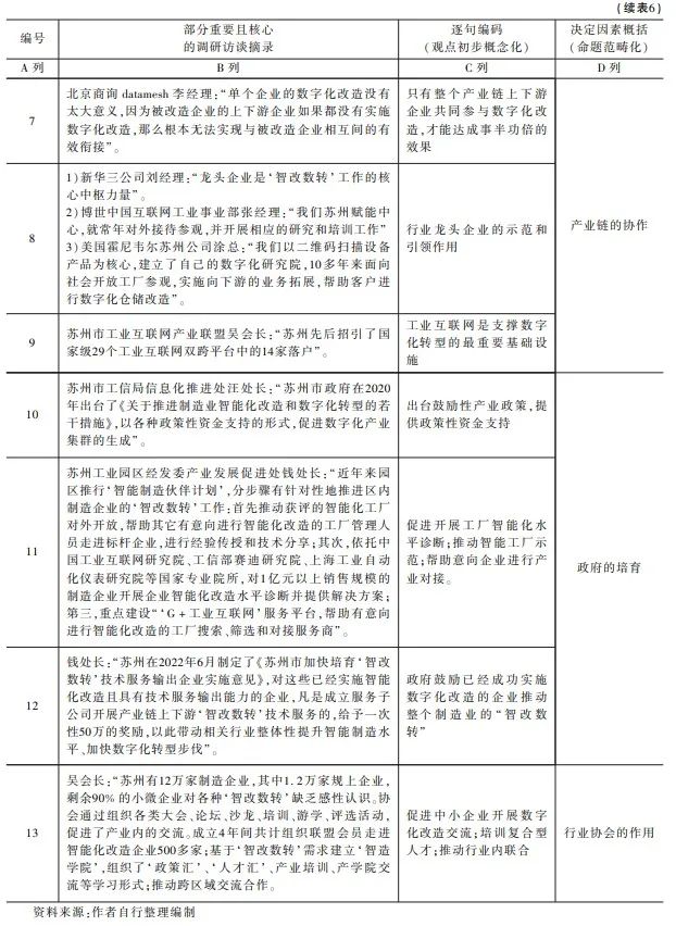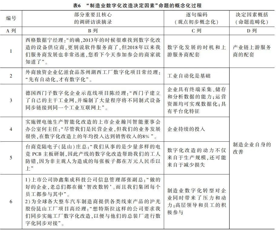 課題組運(yùn)用扎根研究方法,以蘇州制造業(yè)數(shù)字化改造專題調(diào)研的各個活動為研究案例,設(shè)計(jì)了“制造業(yè)數(shù)字化改造決定因素”為主題的研究問題和命題,并運(yùn)用扎根理論中調(diào)研記錄、數(shù)據(jù)的收集和分析方法,將參觀、調(diào)研、研討、訪談、座談過程中凡是對制造業(yè)數(shù)字化改造產(chǎn)生影響的因素進(jìn)行了編碼匯總,依靠對記錄、數(shù)據(jù)進(jìn)行不斷地比較、聚類、歸納,實(shí)現(xiàn)從記錄、數(shù)據(jù)到被調(diào)研者的觀點(diǎn)初步概念化,到命題范疇化,到最終研究問題的達(dá)成。